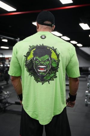 Camiseta oversize verde con diseño del Hulk en espalda y logo California Urban en pecho. Tallas S-XXXL. Suave y resistente…