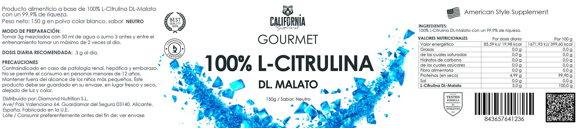 La L-Citrulina DL-Malato de California es un suplemento alimenticio de alta pureza diseñado para potenciar tu rendimiento físico y mejorar la recuperación muscular. Este producto está formulado con un 99,9% de L-Citrulina DL-Malato, proporcionando una fuente confiable de este aminoácido esencial para atletas y entusiastas del fitness.