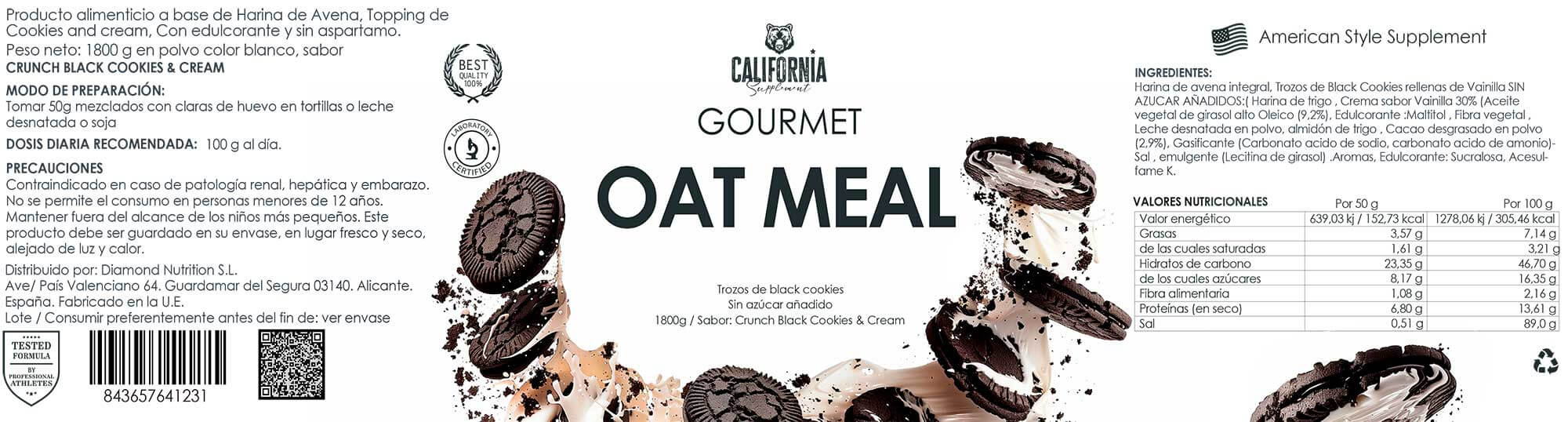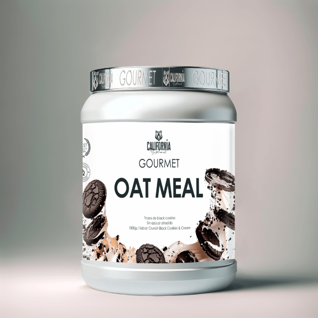 Descubre el Oat Meal Gourmet Topping Crunch Black Cookies & Cream de California, una mezcla deliciosa de avena integral y cookies and cream sin azúcar. Ideal para desayunos y snacks saludables, es alto en proteínas y fibra. Perfecto para energía sostenida y recuperación muscular. ¡Pruébalo!