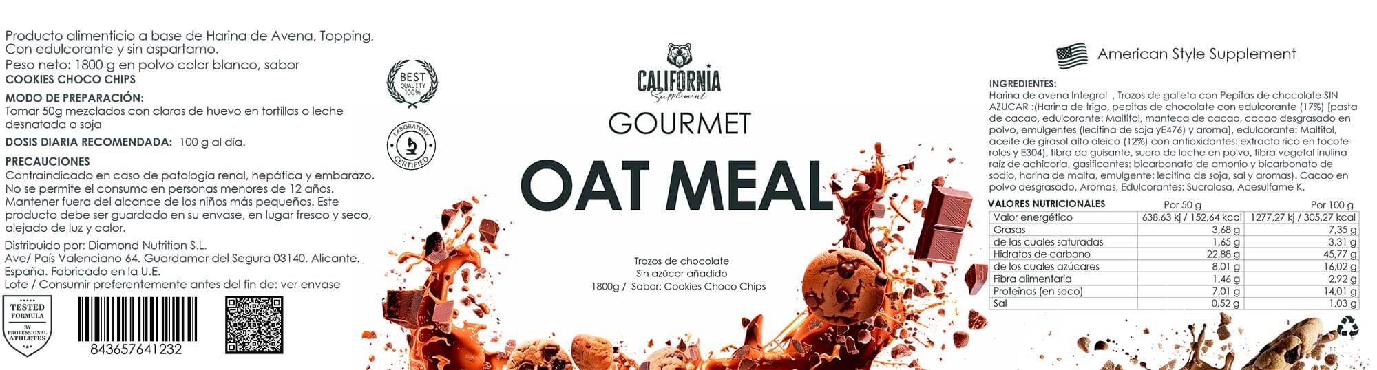 Oat Meal Gourmet Topping Cookies Choco Chips de California es un complemento alimenticio en polvo con trozos de chocolate sin azúcar. Ideal para deportistas, ofrece energía y favorece la recuperación muscular. Sin GMO, fácil de preparar, es perfecto para una dieta saludable y deliciosa.