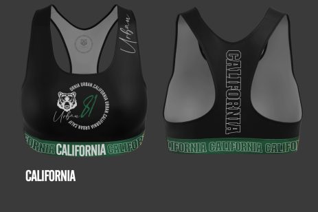 La banda inferior destaca con la palabra “CALIFORNIA” repetida, aportando un estilo deportivo.